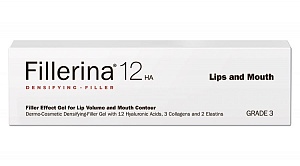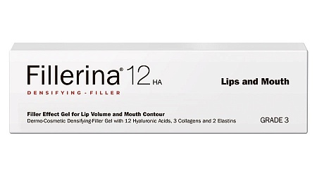 Запатентованная формула геля Fillerina 12HA Densifying-Filler содержит 12 типов гиалуроновых кислот разной молекулярной массы и размера, что обеспечивает их проникновение в глубокие слои кожи. Тем самым поддерживая объем, улучшая состояния тканей вокруг области рта, заполнение и разглаживание морщин. Эффективность гиалуроновых кислот увеличивается дифференцированными молекулярными массами 3ех молекул коллагена и 2ух эластина. Благодаря которым повышается плотность и упругость контура губ и рта. Добавление антарктицина, компонента, который особенно эффективен для стимуляции синтеза коллагена в разных слоях кожи, помогает уменьшить видимые признаки старения контура губ.